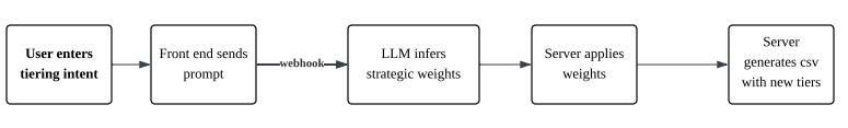 Fig 4. End-to-End LM Workflow- Users communicate their goals using intuitive, high-level language (e.g. “prioritize runway growth”, “reward high-potential emerging accounts”). Front end collects the user’s tiering preference through a chat interface.