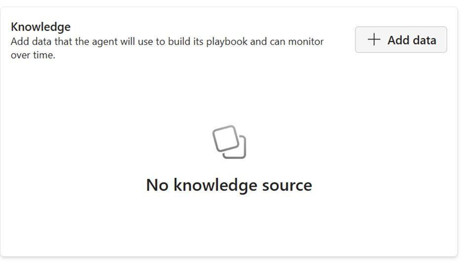 Scroll down on the Agent Setup page to find the Knowledge section. This is where you connect the agent to the data it will monitor. When you first open this section, it will display a message indicating that no knowledge source has been added yet.