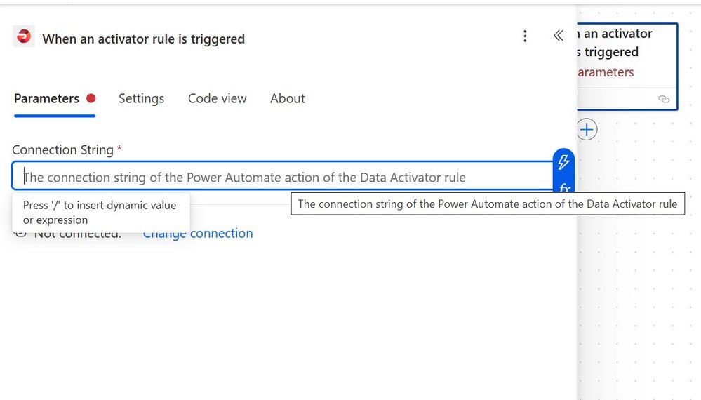 Figure 9. The Power Automate flow builder with the activator trigger and the Connection String field.