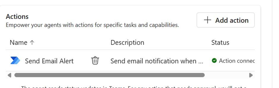 Third, if the recipient approves the action, the agent executes it on behalf of the creator using the creator’s credentials. In this demo, approving the action would trigger the Power Automate flow that sends an email alert.