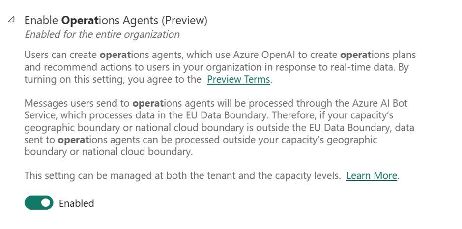 Note that messages sent to Operations Agents are processed through the Azure AI Bot Service. If your capacity is outside the EU Data Boundary, data may be processed outside your geographic or national cloud boundary. Be sure to communicate this to your compliance stakeholders before enabling the feature in production tenants.