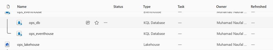 Figure 1. Workspace contents showing the Eventhouse, KQL databases, and Lakehouse ready for the Operations Agent.