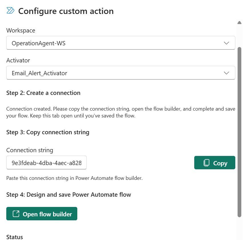 In this pane, you will see several fields. First, select the Workspace where the activator item resides. In this demo, the workspace is OperationAgent-WS. Next, select the Activator, which is the Fabric item that bridges the Operations Agent and Power Automate. Here, the activator is named Email_Alert_Activator.