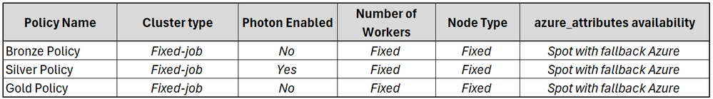 - Create three(3) cluster policies, one(1) per layer, with configurations aligned to the operations performed in that layer (as previously discussed).