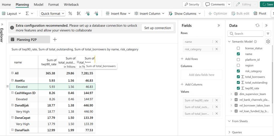 Figure 4. The Planning sheet showing P2P lending platforms with their TWP90 rates, total outstanding balances (in trillions of Rupiah), total borrower counts (in thousands), and risk categories.