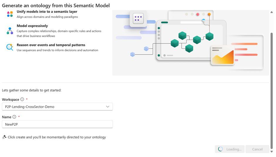 In the dialog, you specify the workspace (P2P Lending CrossSector Demo) and give your Ontology a name (in this example, NewP2P). After clicking Create, Fabric IQ analyzes the Semantic Model's structure, identifies entity types from dimension tables, infers relationships from the foreign key connections, and generates a navigable graph that represents your business domain.