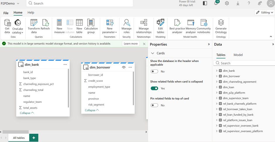 Figure 2. The Semantic Model editor showing entity cards for dim_bank and dim_borrower, with relationship lines and the full table listing in the Data panel.