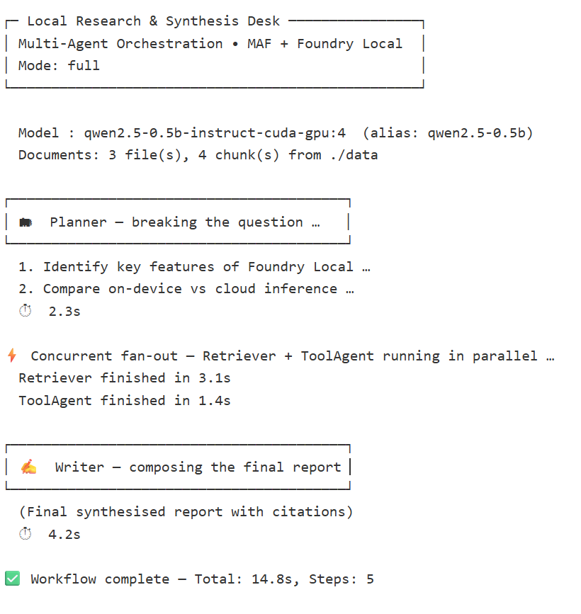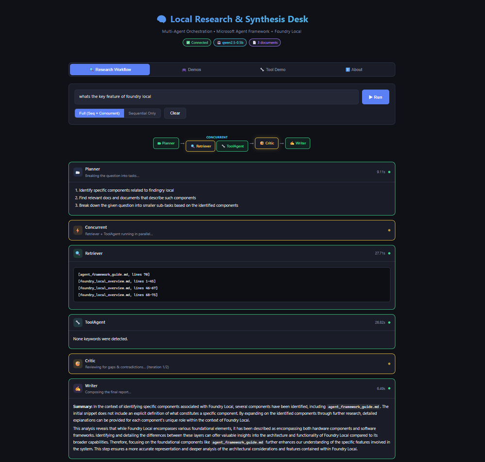What if you could build sophisticated multi-agent workflows entirely on your local machine, with no cloud dependencies? The Local Research & Synthesis Desk demonstrates exactly this. Using Microsoft Agent Framework (MAF) for orchestration and Foundry Local for on-device inference, this demo shows how to create a four-agent research pipeline that runs entirely on your hardware—no API keys, no data leaving your network, and complete control over every step.