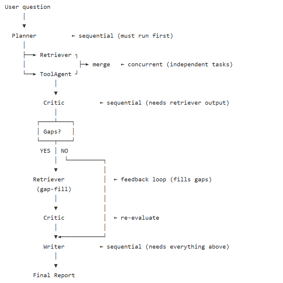 This architecture demonstrates three essential orchestration patterns: sequential pipelines where each agent builds on the previous output, concurrent fan-out where independent tasks run in parallel to save time, and feedback loops where the Critic can send work back to the Retriever for iterative refinement.