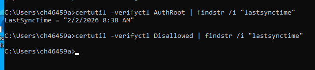 certutil -verifyctl AuthRoot | findstr /i "lastsynctime"