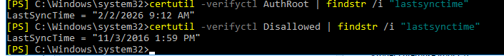 certutil -verifyctl Disallowed | findstr /i "lastsynctime"