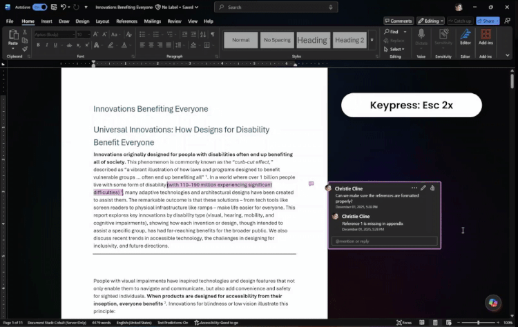 When navigating a document and the insertion point is within text that contains a comment, you can press Alt + F12 to move into the contextual comment card. Once focused on the card, we’ve introduced a few enhancements to make collaboration easier. These updates benefit keyboard users and enhance compatibility across Narrator, JAWS, and NVDA: