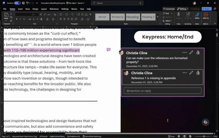 - Smarter use of Home/End: The Home and End keys now behave contextually. Depending on where your focus is – on a comment card, comment thread, or section of text – using the Home or End key now moves you to the beginning or end of that section respectively, making navigation much more seamless.