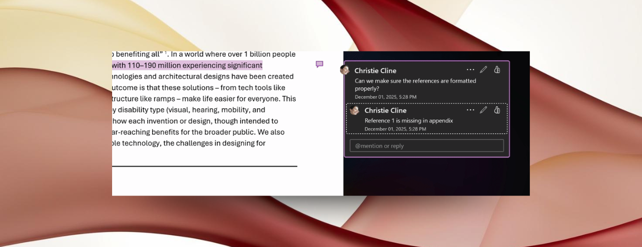 - New Narrator shortcut: For users reading documents with Narrator, we’ve introduced a powerful new shortcut: Ctrl + Shift + ’. This simple shortcut lets users hear the full context of a comment, such as the comment author’s name, any assigned task, and the number of replies (if applicable) – all without having to leave the canvas or shift focus. If the focus is already on a comment card, pressing the same shortcut reads out the commented text range, so users always know what part of the document the comment refers to. If there’s no comment on the selected text, Narrator will announce that clearly, removing any guesswork.