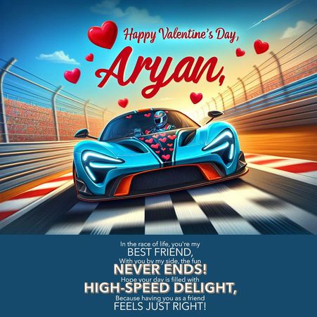 Come up with a Valentine’s Day greetings for my friend Aryan and make it funny with a joke about race cars.