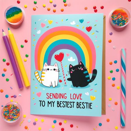 Make me a Valentine’s Day card with cats, sprinkles, and rainbows for a best friend and text saying, “Sending love to my bestest bestie.”