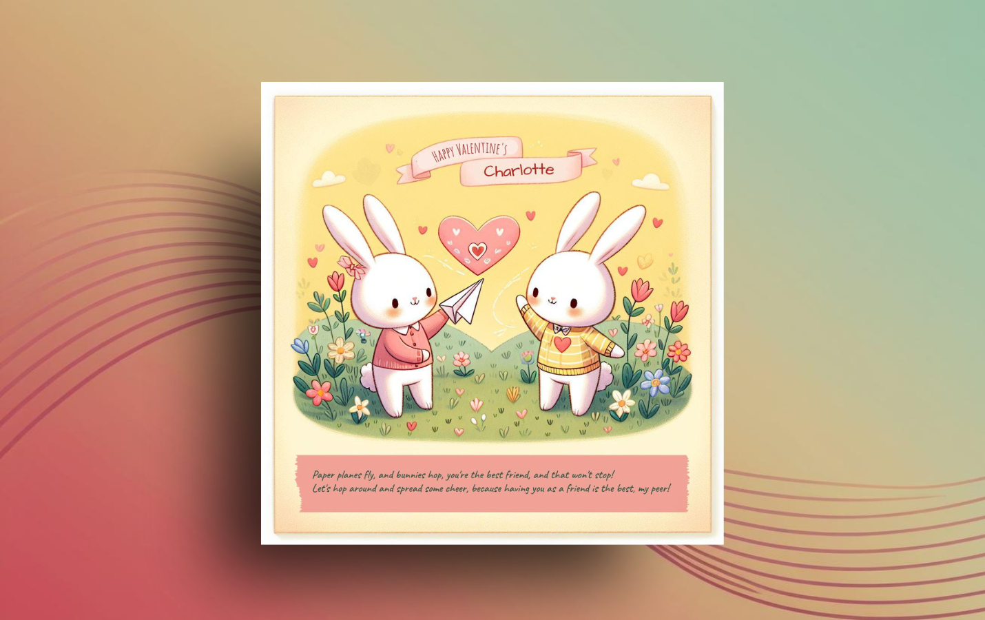 Write a Valentine’s Day greeting card to a female friend named Charlotte. Make it sound cutesy and funny with references to bunnies. Include rhyming words and provide at least 2 sentences.