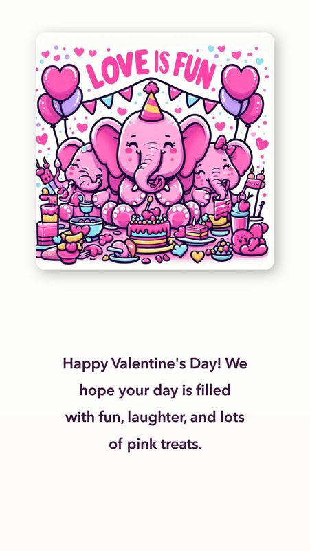 A Valentine’s card for third graders. It should include pink elephants eating pink food at a party.