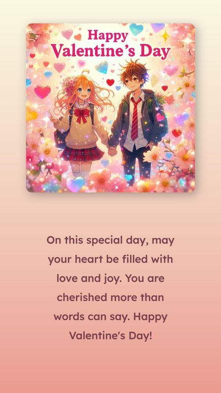 Make a Valentine’s Day card with anime stuff! Use bright colors like pink and red. Put cute anime characters, like a boy and girl holding hands or giving each other a heart. Add lots of hearts, stars, and sparkles. The background should be light with cherry blossom petals falling. Write “Happy Valentine’s Day” in a fun, bubbly font at the top.