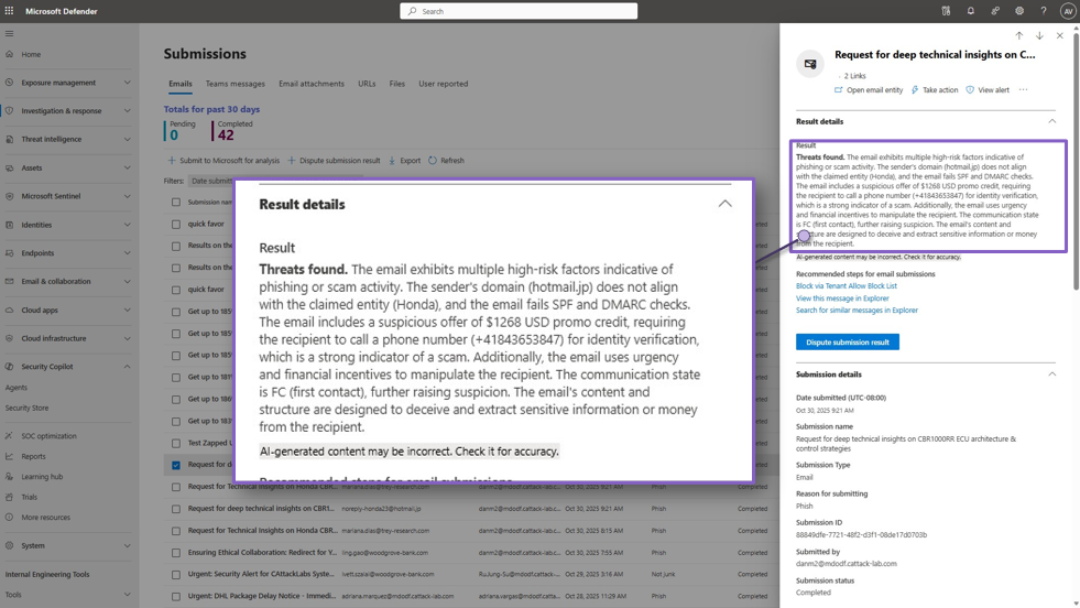 Click the email submission you want to review. A flyout panel will display Result details. - Look for the Agentic AI note