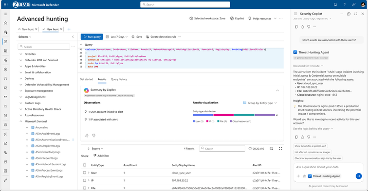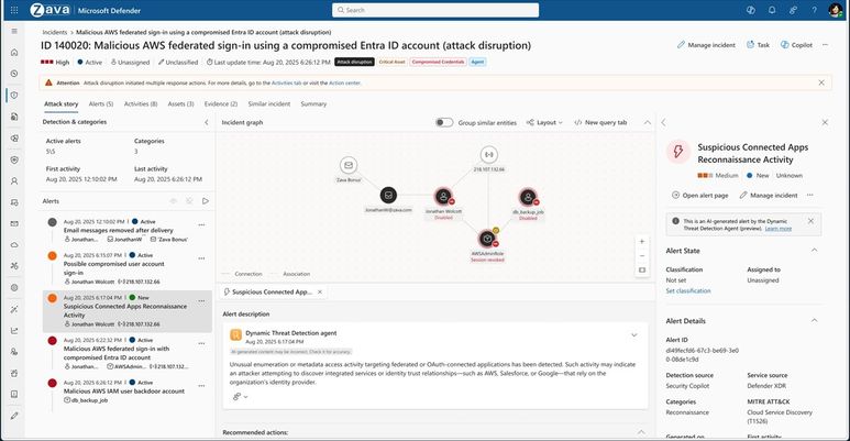 - Dynamic Threat Detection Agent: Detections have long been bottlenecked by the limitations of traditional alerting systems, which rely on predefined logic that can’t scale fast enough to match the speed and variability of modern attacks— resulting in blind spots and missed threats. The Dynamic Threat Detection Agent addresses this challenge head-on. Instead of depending on static rules or isolated input, it continuously analyzes incidents and telemetry, searching for gaps in coverage and correlating signals across the entire security stack. For example, this is how it surfaced a recent AWS attack: a threat actor used an EntraID account to federate into an AWS admin account to exfiltrate sensitive data. The Dynamic Threat Detection Agent generated an alert before the intruder even authenticated into the single sign-on flow, driven by a correlated signal from Sentinel. That alert didn’t exist beforehand; the agent created it on the fly to stop the attack. The result is an adaptive system that extends Microsoft’s industry-leading, research-based detections with context-aware alerts tailored to each organization, closing gaps and revealing threats that legacy systems miss.