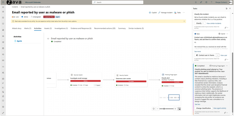 - Phishing Triage Agent: In March 2025, we introduced the Phishing Triage Agent, built to autonomously handle user-submitted phishing reports at scale. The agent classifies incoming alerts and resolves false positives, escalating only the malicious cases that require human expertise. At Microsoft Ignite, we’re announcing its general availability, backed by strong early results: the agent identifies 6.5 times more malicious alerts, improves verdict accuracy by 77%, and frees analysts to spend 53% more time investigating real threats. St. Luke’s even said it’s saving their team nearly 200 hours each month. Coming soon, we’ll be extending these autonomous triage capabilities beyond phishing to identity and cloud alerts, bringing the same precision and scale to more SOC workflows.
