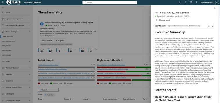 - Threat Intelligence Briefing Agent: Introduced in March, this agent has already helped security teams move from reactive to anticipatory defense. At Ignite, we’re announcing that the Threat Intelligence Briefing Agent is now fully embedded in the Microsoft Defender portal, delivering daily, tailored briefings that synthesize Microsoft’s unparalleled global intelligence with organization-specific context in just minutes. Teams no longer need to spend hours gathering TI from disparate sources—the agent automates this process, offering the most current and relevant insights. Analysts can reference the summary to prioritize action, using the agent’s risk assessments, clear recommendations, and links to vulnerable assets to proactively address exposures.