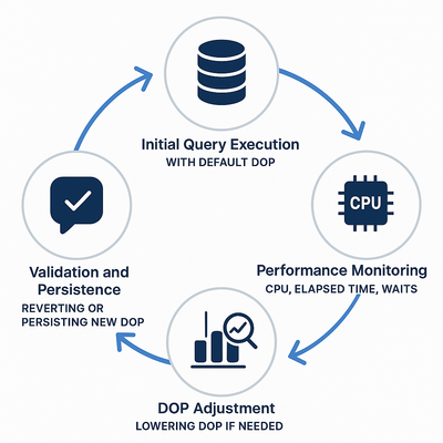 - Validation: If performance improves and is stable, the new DOP is persisted. If not, the DOP recommendation will be reverted to the previously known good DOP setting, which is typically the original setting that the feature used as a baseline.