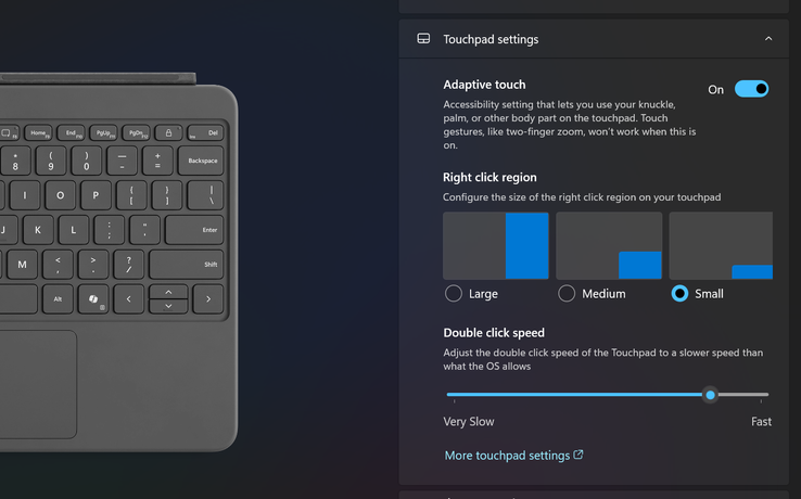Another shift is adaptive touch mode, built directly into the Surface touchpad and easily toggled on through the Surface app. For many people with limb differences, Cerebral Palsy, or mobility conditions such as arthritis, standard touchpads can be difficult or impossible to use. Adaptive touch mode changes that.