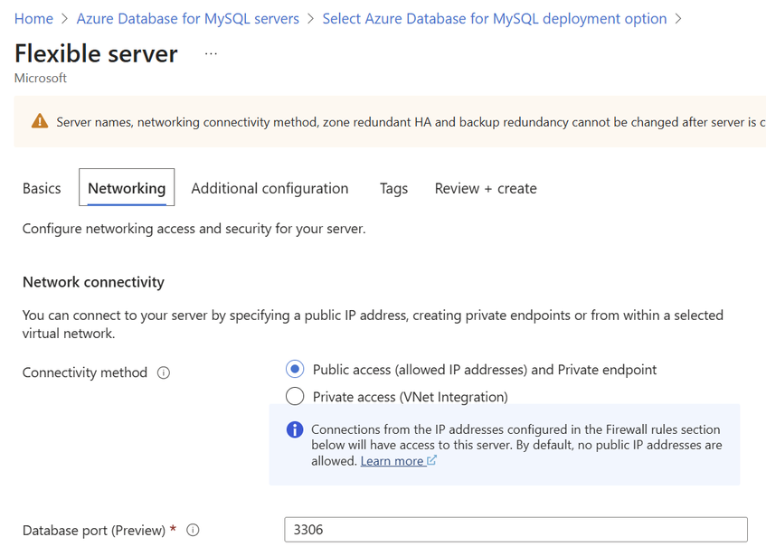 What’s new in GA (vs. Public Preview): In the Public Preview (July 2025), custom ports were only supported for VNet-injected (private access) servers, with no support for public access or Private Link connectivity. Now, with GA, you can create custom-port servers in any network configuration – including both publicly accessible servers and those using Private Link (private endpoint) connectivity. In short, all new MySQL flexible servers can be created with a custom port, whether they are configured for public network access or deployed into a private virtual network.