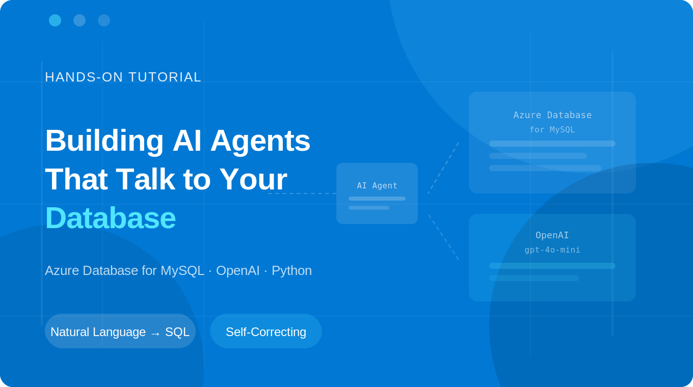 In this tutorial, you'll build a Python-based AI agent that connects to Azure Database for MySQL server and uses OpenAI's function calling to translate natural language questions into SQL queries, execute them, and return human-readable answers. The agent can explore your schema, answer business questions, and even self-correct when it writes invalid SQL.