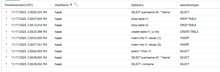 |project TimeGenerated,UserName,SqlQuery,operationtype