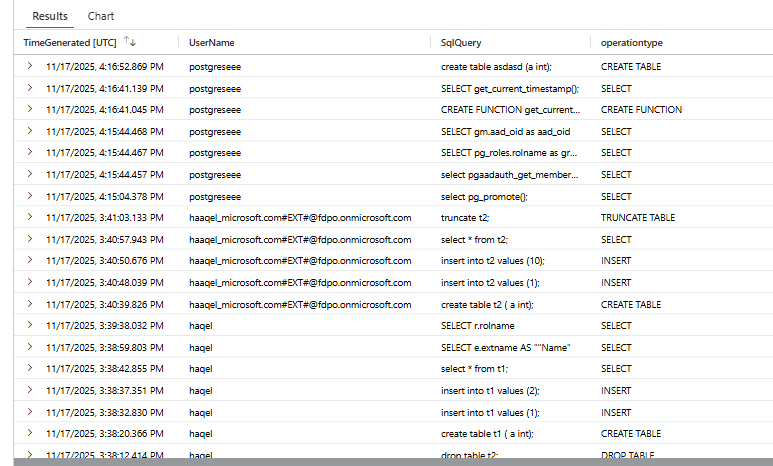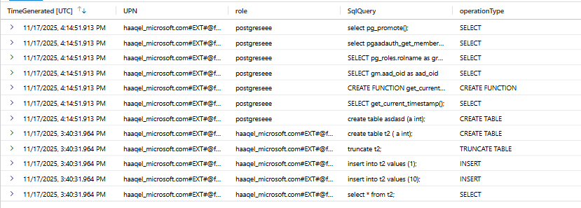 - Audits in Azure database for PostgreSQL flexible server with Microsoft Entra Authentication.