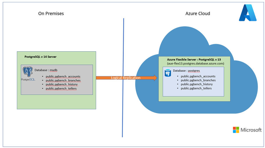 This article will hopefully provide you with enough information on the core concepts involved in logical replication and should then allow you to adapt those learnings to your own environment, where you may already have the source database and existing tables with data. In this article I will focus on using logical replication to setup a selective one-way replication from an on-prem instance of a PostgreSQL database to a Flex instance on the Azure cloud in line with the diagram below:
