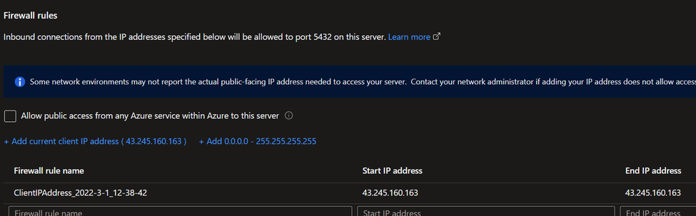 Moving on to my Azure Flex instance, it already allows access from my on-prem IP address as I added a rule for that: