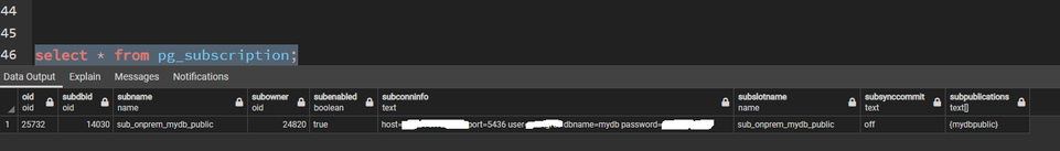 create subscription sub_onprem_mydb_public connection 'host=dns.or.ip.of.yourserver port=yourport user=youruser dbname=postgres password=yourpassword' publication mydbpublic;