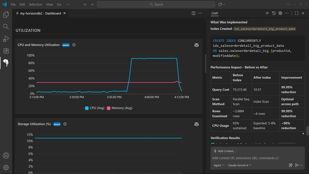 One of the key new capabilities is Metrics Intelligence, which uses Copilot and real-time telemetry of HorizonDB or ADP to help you diagnose and fix performance issues in seconds. Instead of digging through logs and query plans, you can open the Performance Dashboard, see a CPU spike, and ask Copilot to investigate. The extension sends a rich prompt that tells Copilot to analyze live metrics, identify the root cause, and propose an actionable fix. For example, Copilot might find a full table scan on a large table, recommend a composite index on the filter columns, create that index, and confirm the query plan now uses it. The result is dramatic: you can investigate and resolve the CPU spike in seconds, with no manual scripting or guesswork, and with no prior PostgreSQL expertise required.