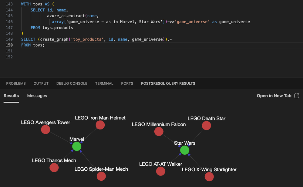 The extension also makes it easier to work with graph data. HorizonDB and ADP support open-source graph extension Apache AGE. This turns these services into fully managed graph databases. You can run graph queries against HorizonDB and immediately visualize the results as an interactive graph inside VS Code. This helps you understand relationships in your data faster, whether you’re exploring customer journeys, network topologies, or knowledge graphs - all without switching tools.