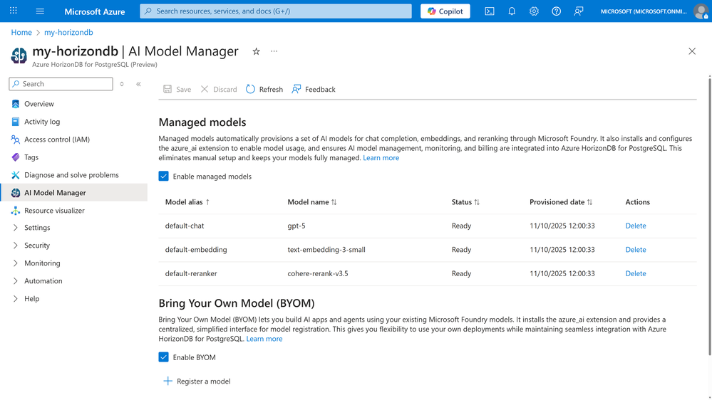 AI Model Management elevates the experience of using semantic operators within PostgreSQL. When activated, it provisions key models for embedding, semantic ranking and generation via Foundry, installs and configures the azure_ai extension to enable the operators, establishes secure connections, integrates model management, monitoring and cost management within HorizonDB.