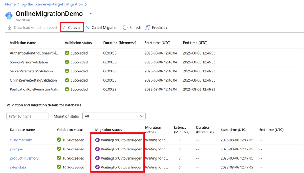 A cutover is performed when the Azure Database for PostgreSQL - Flexible Server is in complete sync with the Postgres source, resulting in minimal downtime.