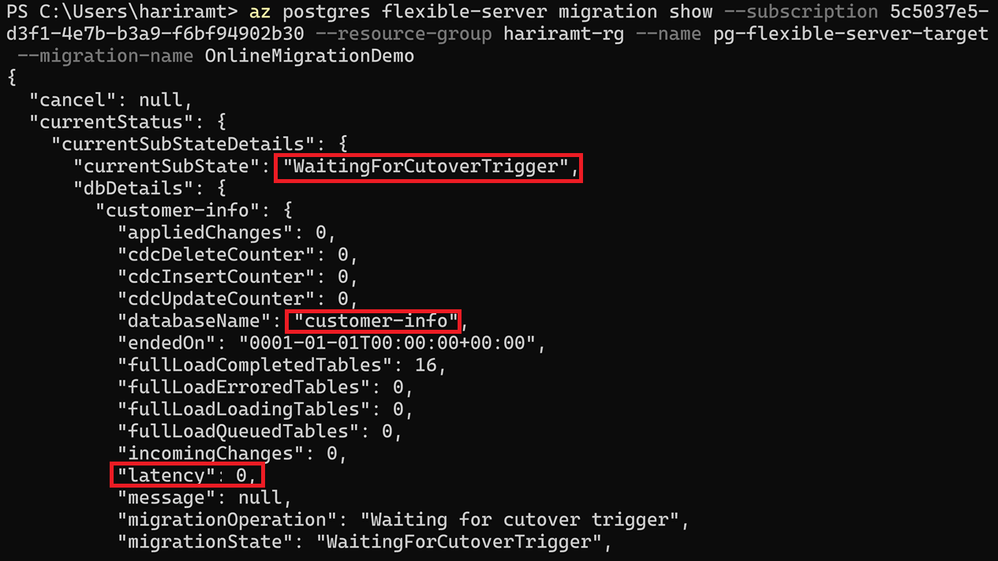 In the ‘OnlineMigrationDemo’ above, the Latency is 0 for the ‘customer-info’ Database being migrated which indicates that the target is in sync with the source.