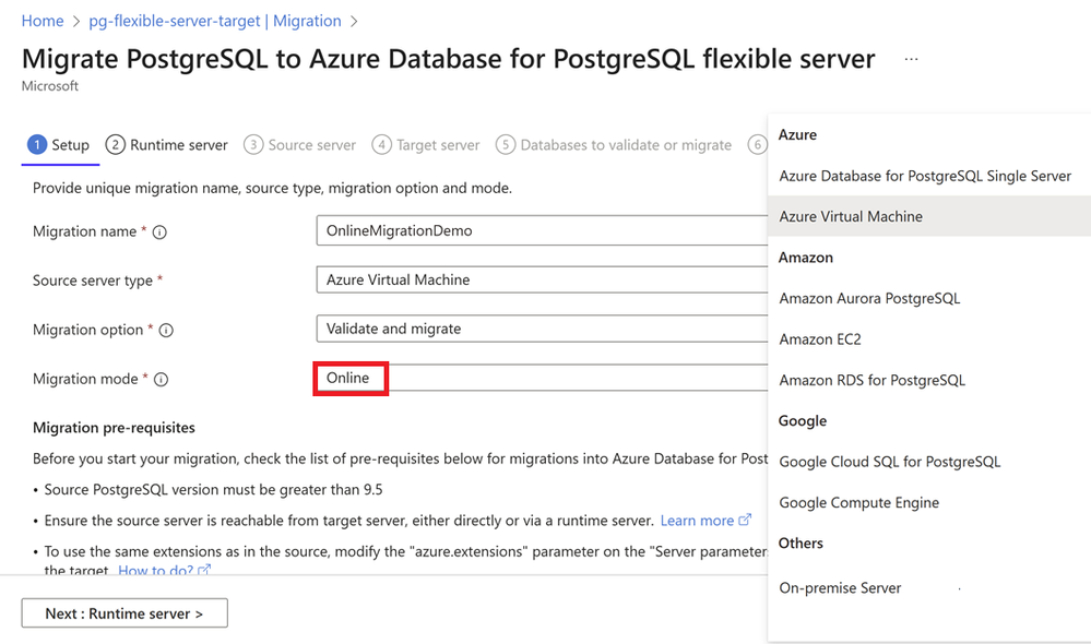 Figure 1: Screenshot from the Azure Portal from the Migration setup page. Here you can select the “Online” migration mode to migrate from any of the listed PostgreSQL sources to Azure Database for PostgreSQL- Flexible server