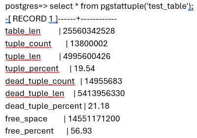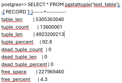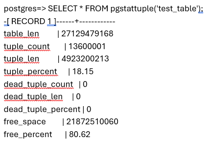 SELECT * FROM pgstattuple('your_table_name');