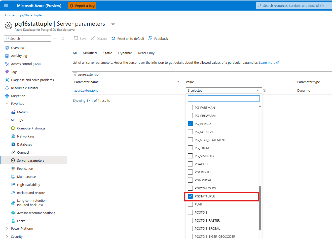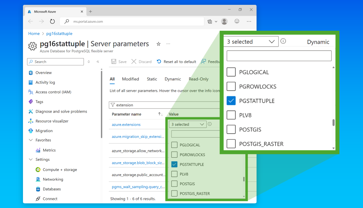 Add pgstattuple to the azure.extensions server parameter.