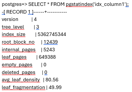 - leaf_fragmentation: Remained the same after VACUUM and reduced to 0 after pg_repack depicting no page fragmentation happening