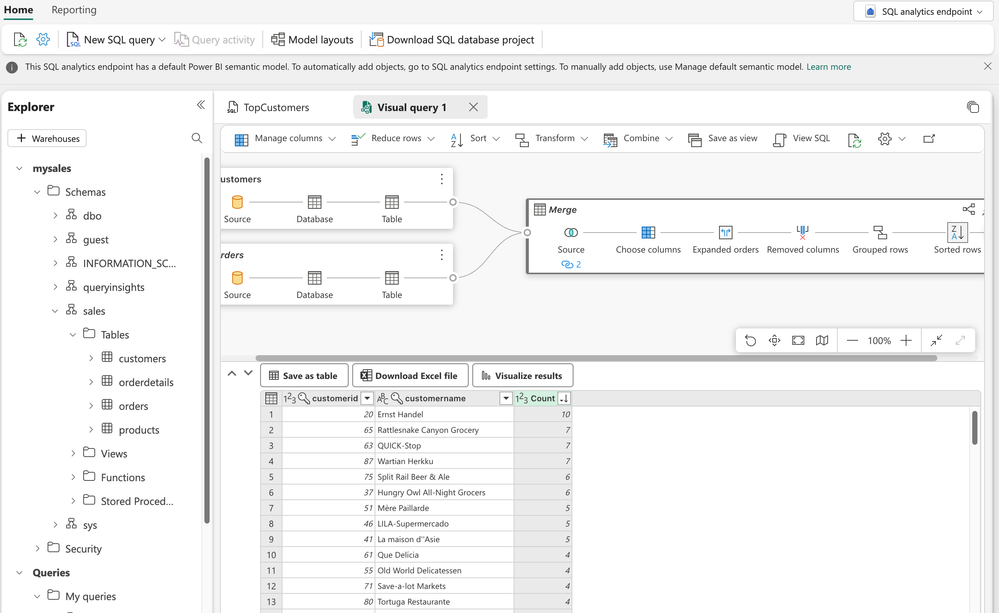 - From your mirrored database artifact, you can switch to “SQL analytics endpoint” panel, where you can start running your SQL queries on continuously replicated data from Azure Database for PostgreSQL Flexible Server to Fabric OneLake for analytics: