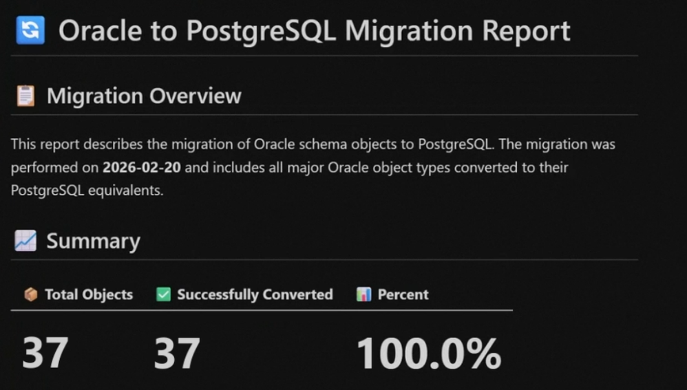 The AI-assisted Oracle to PostgreSQL migration tool dramatically simplifies moving off Oracle databases. Accessible through VS Code, the tool uses intelligent automation, powered by GitHub Copilot, to convert Oracle database schemas and PL/SQL code into PostgreSQL-compatible formats. It can analyze Oracle schema, and automatically translate table definitions, data types, and even stored procedures/triggers into PostgreSQL equivalents speeding up migrations that once took months of manual effort.