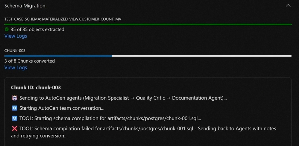Each chunk is converted, validated, and deployed. If validation fails, the agents auto correct and retry. This self-healing loop ensures high conversion accuracy. Essentially, the tool conducts compile-time validation against a live PostgreSQL instance to catch issues early and reduce downstream surprises.