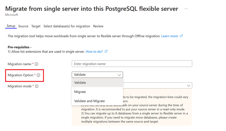 Single to Flexible server migration just got easier! We are excited to introduce the Pre-Migration Validation feature for the Single Server to Flexible Server Migration tool. After a thorough analysis of past migrations, the team identified that a considerable number of attempts faced setup-related hurdles. To tackle this, Pre-Migration Validation has been crafted to thoroughly check the readiness of both your source and target servers. The process is neatly integrated into the Azure Portal experience, offering you flexibility to: