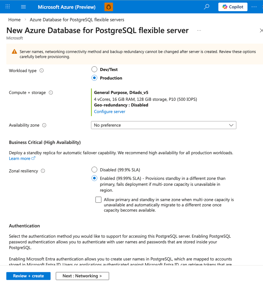 High Availability is important to ensure that you have your primary and standby servers deployed with same-zone or zone-redundant HA option. Zonal resiliency helps you protect your workloads against zonal outage. With the latest update, Azure Portal introduces a Zonal Resiliency setting under the High Availability section. This setting can be toggled Enabled or Disabled: